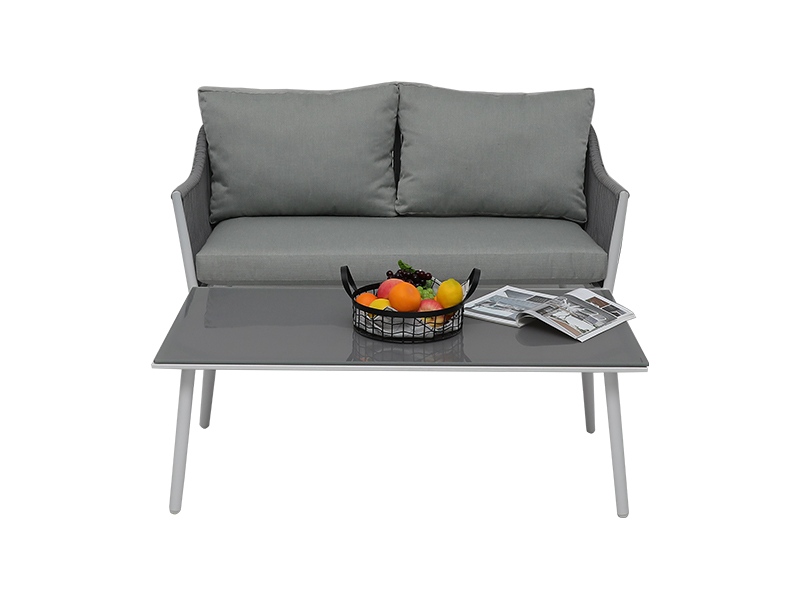 | 仕様 | ロープが編まれたアルミフレーム、合計4個。ラブシート: L75 * W135 * H76cm、1 PC シングルチェア: L75 * W75 * H76cm、2 PCS コーヒーテーブル: L114 * W60 * H38.5 cm、5 mm 強化グレーガラス、1 PC |